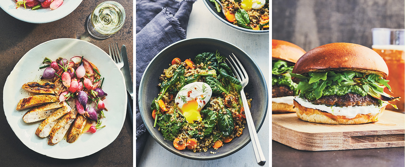 Un condiment au goût piquant est de mise pour équilibrer le goût prononcé de l’agneau. Voilà pourquoi on utilise la roquette pour réaliser un pesto relevé dans lequel on trouve aussi des graines de citrouille à la place des noix de pin. En plus de la garniture de pesto, on ajoute à chaque burger une bonne dose d’oignons rôtis et de la crème sure plutôt que de la mayonnaise.