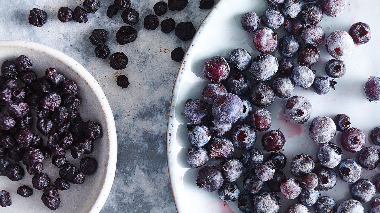 Au-delà de la farine, du miel, du vinaigre de cidre et du beurre qui sont produits ici, ce sont les bleuets, notre petit fruit national, qui le sont assurément. Non seulement ils sont bien représentés au rayon des produits surgelés, mais on peut maintenant se les procurer séchés. Sous cette forme, leur bon goût se concentre et, comme les canneberges séchées, ils nous inspirent des recettes tant salées que sucrées comme ici, avec notre interprétation 100% locale des traditionnelles galettes à la mélasse.
