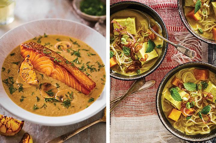 This Asian-inspired vegetarian soup is based on a vegetable broth enhanced by miso, curry paste and coconut milk. Sweet potatoes are cooked in the liquid, while the tofu is only added at the end. Ladle out the sweet potatoes and tofu into bowls alongside rice noodles before adding the hot broth. Shallots, green onions and mint give a touch of freshness to this aromatic medley.