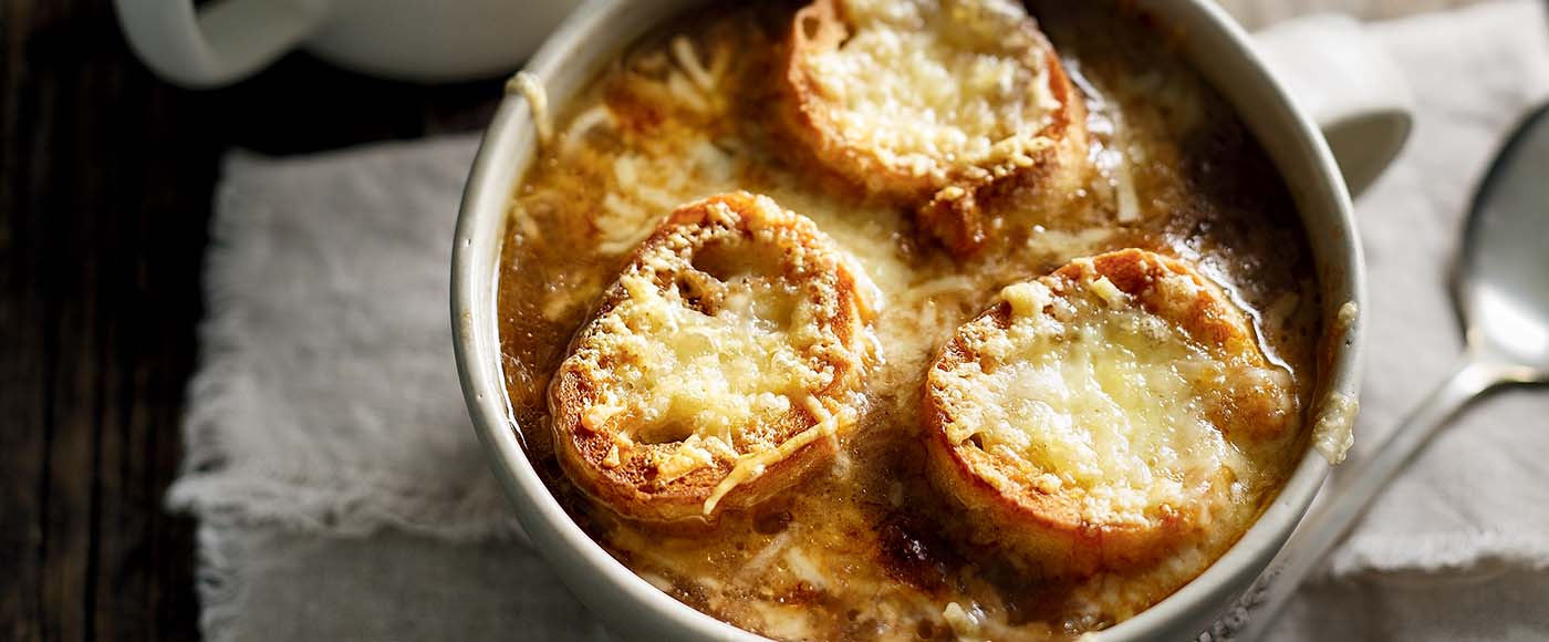 Un bouillon aux oignons, un croûton croustillant et du fromage gratiné font presque de cette soupe un repas complet.